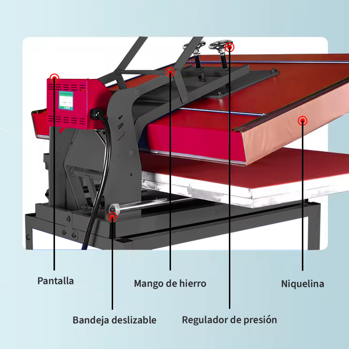 Equipada con un pedestal que proporciona estabilidad y altura adecuada para trabajar cómodamente, esta plancha sublimadora es adecuada tanto para pequeñas empresas que buscan expandir su oferta de productos personalizados como para grandes operaciones que requieren eficiencia y precisión en la producción.